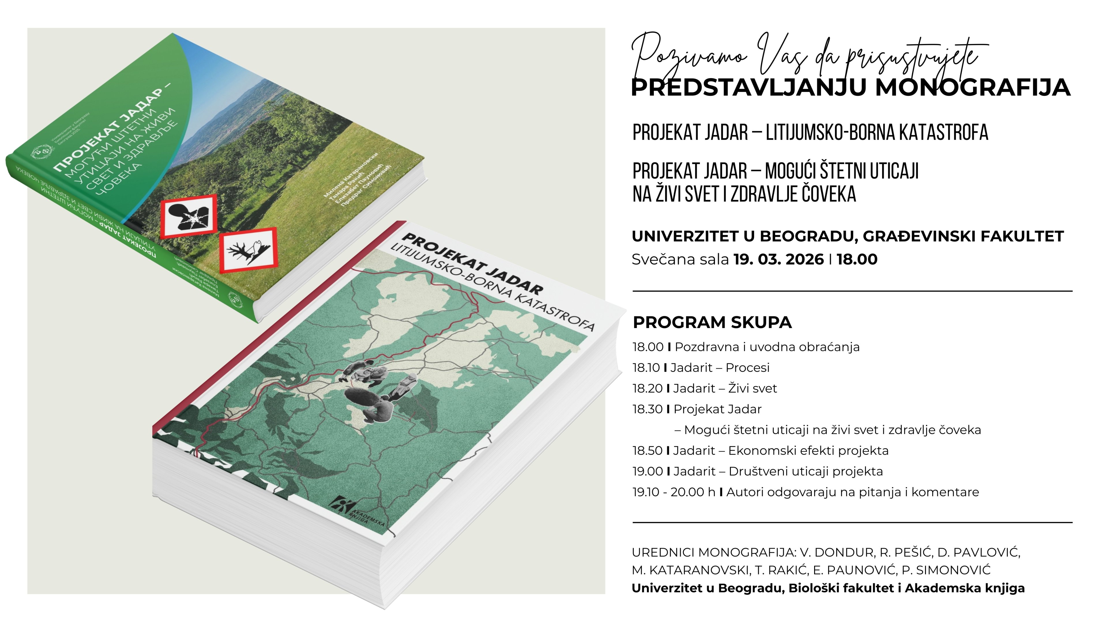 Дана 19.03.2026. године у 18 čасова, на Грађевинском факултету у Београду, биђе одржана презентација две монографије на тему пројекта Јадар: ПРОЈЕКАТ ЈАДАР - ЛИТИЈУМСКО БОРНА... више
