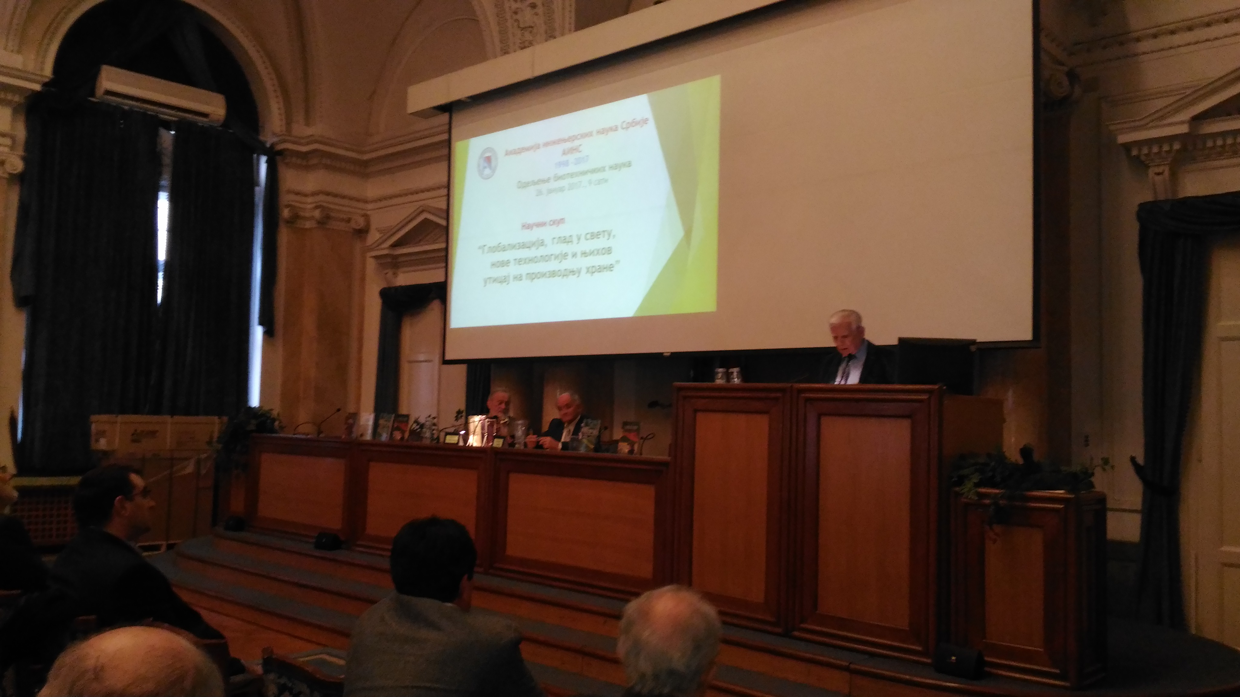 Научни скуп „Глобализација, глад у свету, нове технологије и њихов утицај на производњу хране“ одржан је 26. 01.2017. у 9.30 сати у Свечаној сали на Грађевинском факултету у Београду. Скуп је организовало Одељење биотехничких наука АИНС.